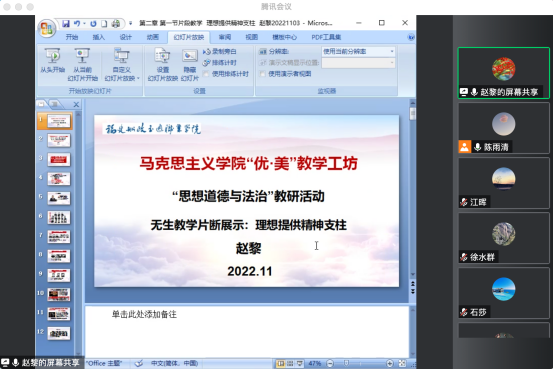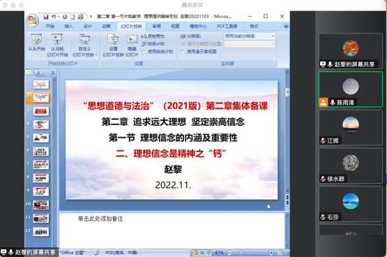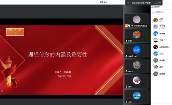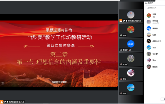 11月2日,馬克思主義學院思想道德與法治教研室開展了“優(yōu)·美”教學工作坊線上集體備課活動。本次教研活動圍繞《思想道德與法治》第二章《追求遠大理想堅定崇高信念》第一節(jié)《理想信念的內(nèi)涵及重要性》展開。此次教研活動由陳雨清老師擔任主講,趙黎老師進行無聲片段教學展示。德法教研室全體專任教師和部分校內(nèi)兼任教師老師參加了此次活動。