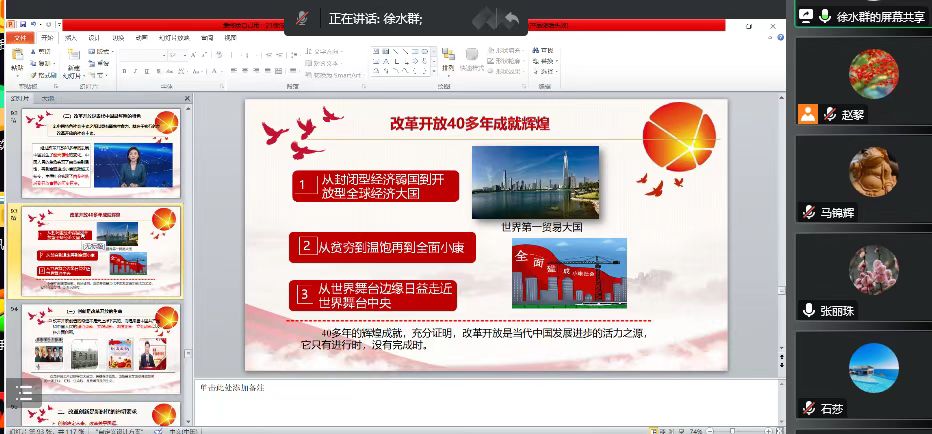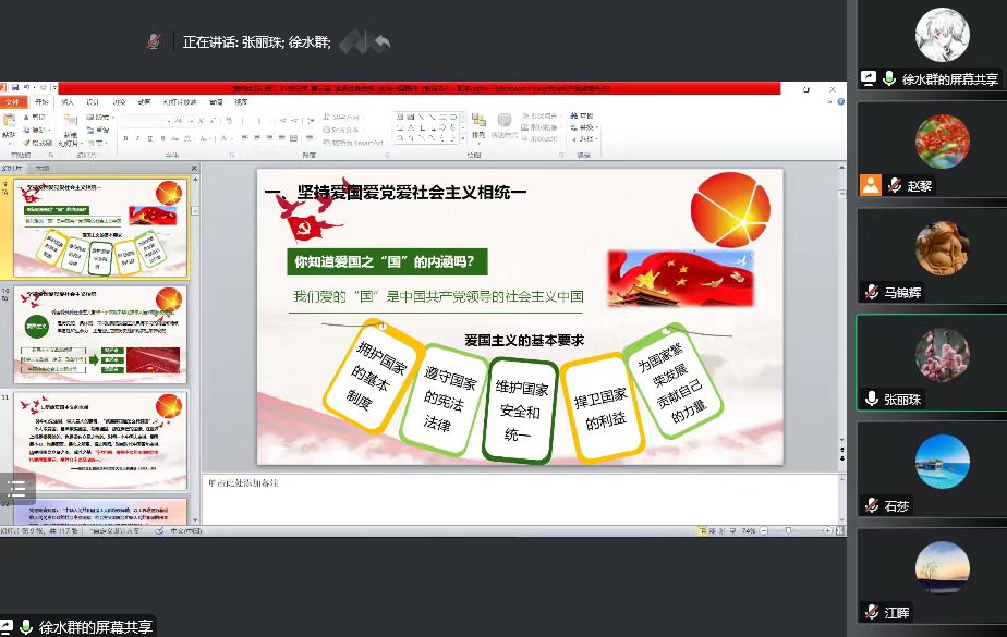 2022年11月30日下午2:30,思想道德與法治教研室舉行了本學(xué)期最后一次集體備課會,由于疫情原因,本次集備采用線上方式開展,由教研室主任李春香老師主持,徐水群老師主講,內(nèi)容為《思想道德與法治》第三章第二三節(jié)“做新時代的忠誠愛國者,讓改革創(chuàng)新成為青春遠(yuǎn)航的動力”,全體專兼職教師參加了此次集體備課會。