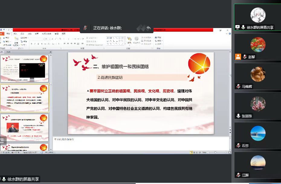 為取得更好的教學(xué)效果,徐水群老師精心準(zhǔn)備,通過上網(wǎng)查找資料、撰寫教案、制作課件,結(jié)合自己的教學(xué)經(jīng)驗(yàn)、結(jié)合時事政治,對如何調(diào)動學(xué)生積極性,如何處理教材進(jìn)行了仔細(xì)推敲,取得了較好的效果。在第一節(jié)什么是中國精神、為什么要弘揚(yáng)中國精神的基礎(chǔ)上,本次集備主要講述應(yīng)該如何弘揚(yáng)中國精神。徐水群老師通過典型案例、深入剖析講解突出重點(diǎn)、突破難點(diǎn),依據(jù)大中小思政一體化的“大思政”理念,通過回顧中學(xué)內(nèi)容,更加深刻理解大學(xué)理論知識,達(dá)到事半功倍的效果。如講到民族團(tuán)結(jié)時,通過回顧我國民族分布的特點(diǎn);我國處理民族問題的根本原則;我國的民族政策等問題,更加深刻領(lǐng)會習(xí)近平總書記講的“要鑄牢中華民族共同體意識,促進(jìn)各個民族像石榴籽一樣緊緊抱在一起”。