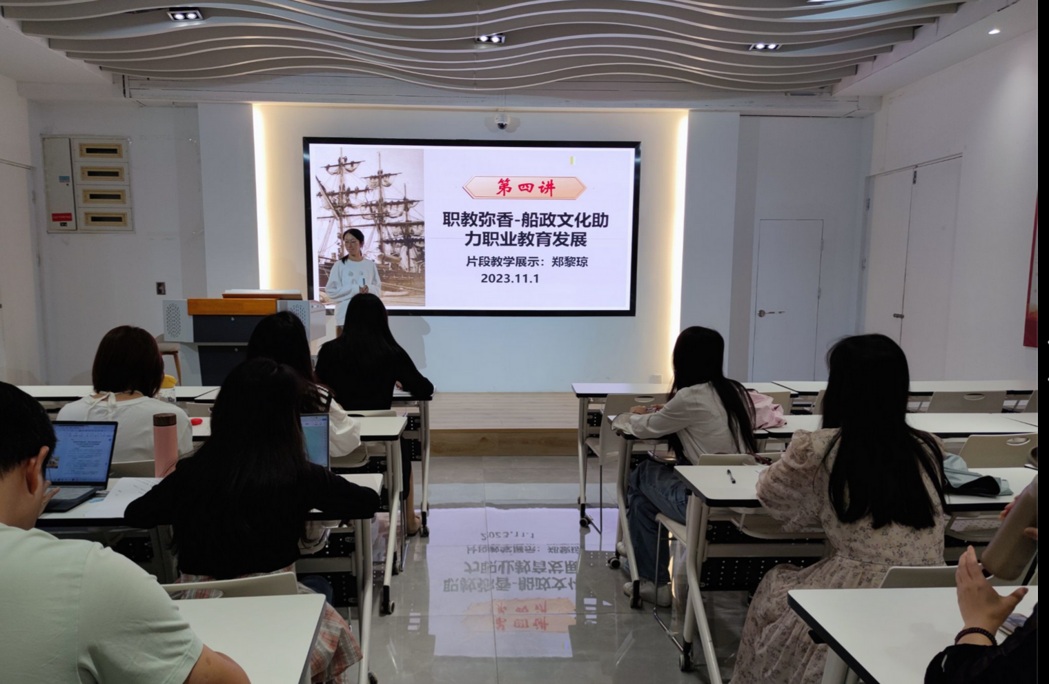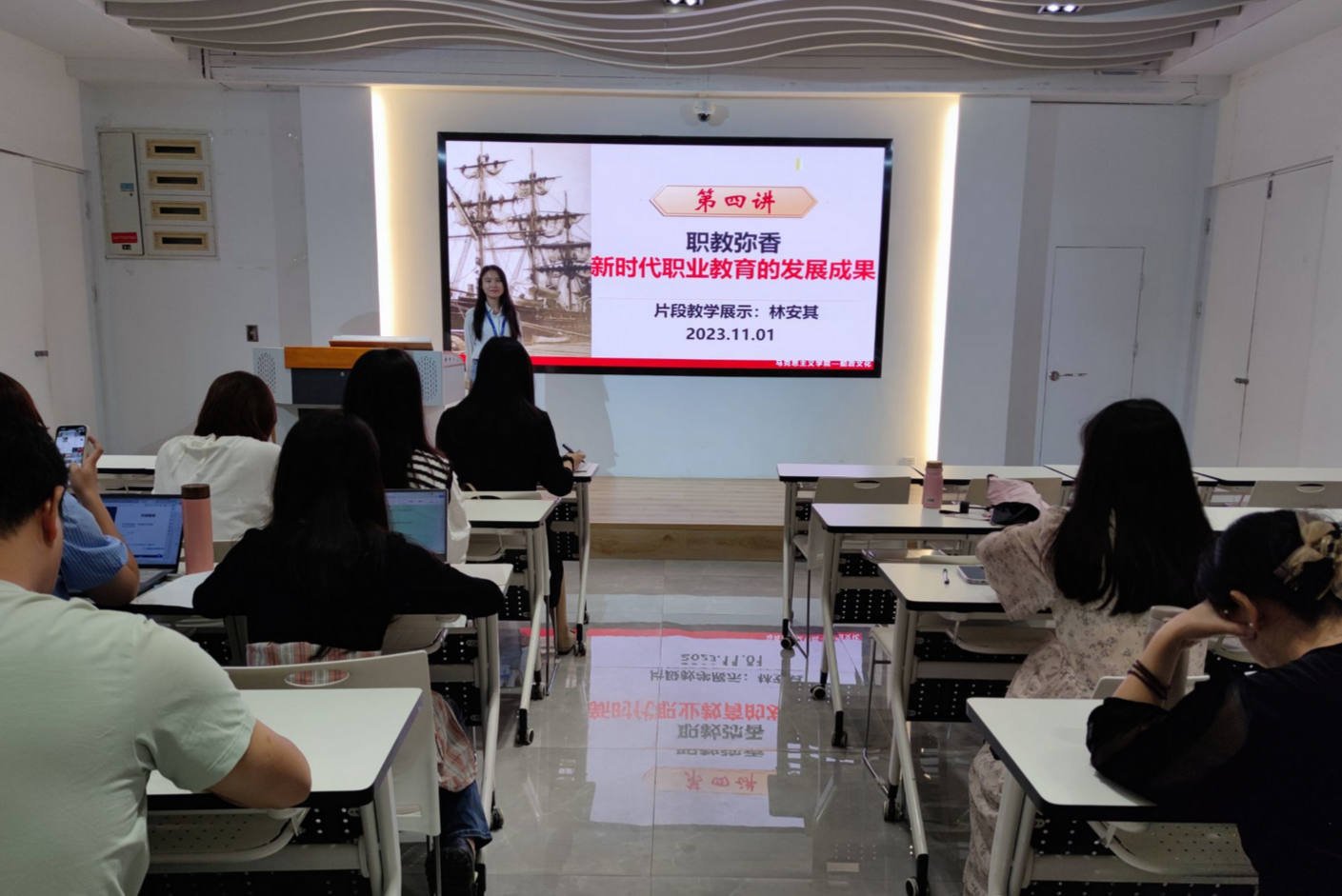 隨后,鄭黎瓊老師和林安其老師分別從《船政文化的主要內涵》《新時期職業(yè)教育的主要成就》兩方面做了片段教學的展示。