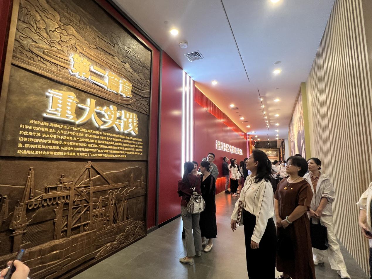 成就展從序廳氣勢(shì)恢宏的巨幅漆畫《閩山閩水物華新》展開,以“3820”戰(zhàn)略工程為主線,分“戰(zhàn)略擘畫、重大實(shí)踐、賡續(xù)奮斗”三大篇章,全方位、多角度展現(xiàn)了“3820”戰(zhàn)略工程實(shí)施30年來福州的發(fā)展歷程和輝煌成就,充分反映了“3820”戰(zhàn)略工程的科學(xué)性、前瞻性、系統(tǒng)性。在講解員的引導(dǎo)下,大家沿著歷史的軸線,在一張張感人的歷史照片、一段段生動(dòng)的視頻影像、一件件珍貴的實(shí)物展品前,駐足觀看、認(rèn)真端詳、細(xì)細(xì)品讀,重溫習(xí)近平總書記在福州工作期間開創(chuàng)的重要理念和重大實(shí)踐,真切感受30年來福州的發(fā)展巨變,深入感悟習(xí)近平總書記高瞻遠(yuǎn)矚的戰(zhàn)略思維、銳意創(chuàng)新的改革思路、求真務(wù)實(shí)的工作作風(fēng)和人民至上的執(zhí)政理念,進(jìn)一步增強(qiáng)“學(xué)思想、強(qiáng)黨性、聽黨話、跟黨走”的責(zé)任感和使命感。