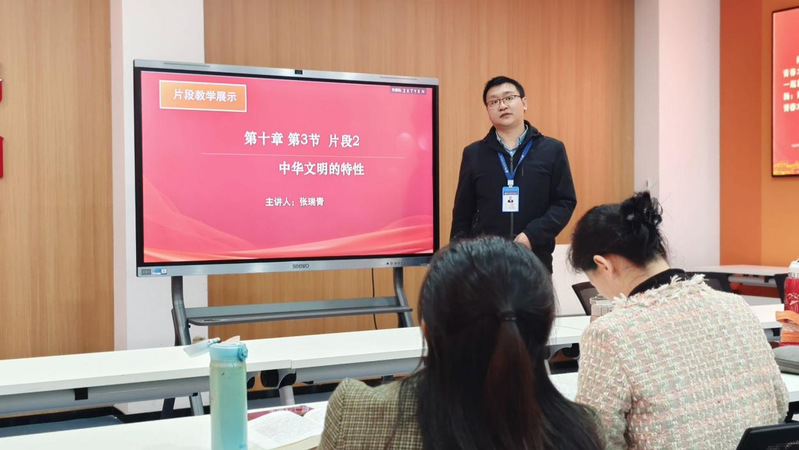 張玉祥和張瑞青兩位老師分別就《繁榮發(fā)展社會主義文化事業(yè)和文化產(chǎn)業(yè)》與《中華文明五大特性》兩個教學(xué)內(nèi)容展開片段教學(xué)展示。他們采用生動的案例,講授內(nèi)容條理清晰,綜合運(yùn)用多種教學(xué)方法,既體現(xiàn)了思政課教學(xué)的學(xué)理性,也突顯了高職思政課教學(xué)的生動性,取得了良好的示范效果。