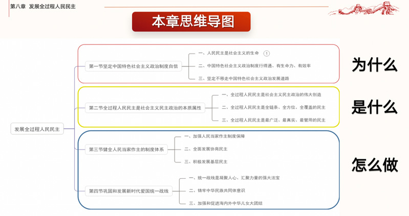 范碧華老師首先強(qiáng)調(diào)發(fā)展全過程人民民主是新時(shí)代我國(guó)民主政治建設(shè)的歷史性成就、標(biāo)志性成果,明確本章在教材中的地位;接著通過教學(xué)思維導(dǎo)圖,明晰第八章四節(jié)內(nèi)容間的整體邏輯關(guān)系,明確教學(xué)難重點(diǎn);在學(xué)情分析基礎(chǔ)上,對(duì)于本章的教學(xué)方法、案例選取給出教學(xué)建議。整個(gè)教學(xué)設(shè)計(jì)邏輯清晰、目標(biāo)明確,較好地提升了教師對(duì)第八章教學(xué)內(nèi)容及邏輯的認(rèn)識(shí)。