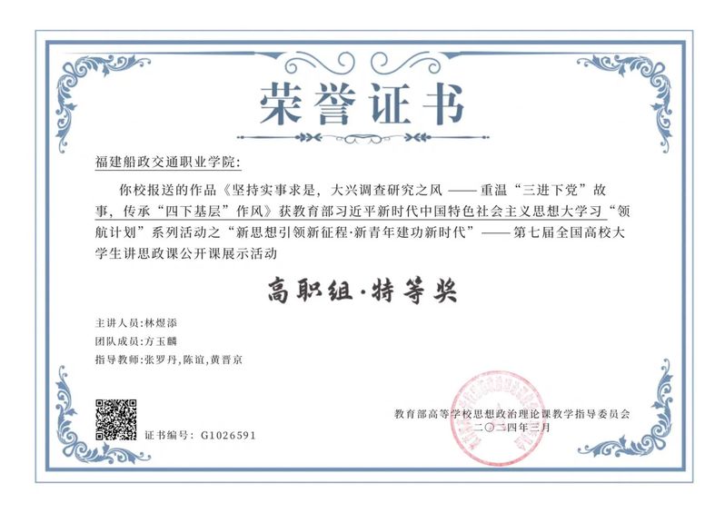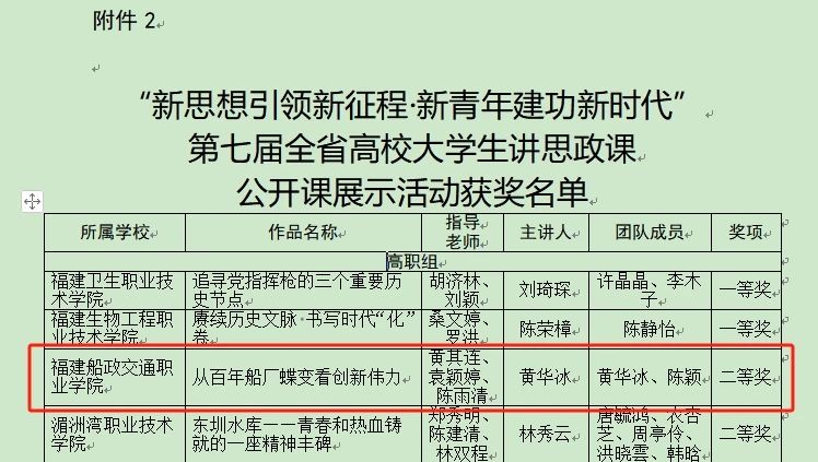 日前,根據(jù)教育部高校思政課教學(xué)指導(dǎo)委員會和福建省委教育工委的評審結(jié)果,我院選送的作品《堅持實事求是,大興調(diào)查研究之風(fēng)——重溫“三進下黨”故事,傳承“四下基層”作風(fēng)》榮獲第七屆全國高校大學(xué)生講思政課公開課展示活動高職組特等獎,《從百年船廠蝶變看創(chuàng)新偉力》榮獲第七屆全省高校大學(xué)生講思政課公開課展示活動高職組二等獎。