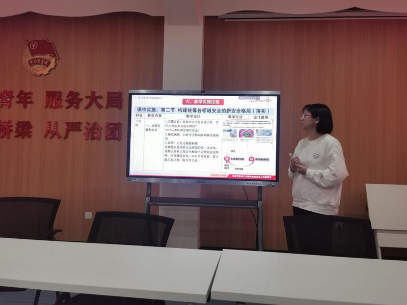 藍素瓊、張羅丹兩位老師分別就《把維護政治安全放在首要位置》與《統(tǒng)籌發(fā)展和安全》兩個教學(xué)內(nèi)容展開片段教學(xué)展示。整個展示過程重點突出,邏輯清晰,案例、視頻使用貼切,既呈現(xiàn)了大學(xué)思政課教學(xué)的學(xué)理性,也凸顯了高職思政課教學(xué)的活躍性,取得了良好的示范效果。