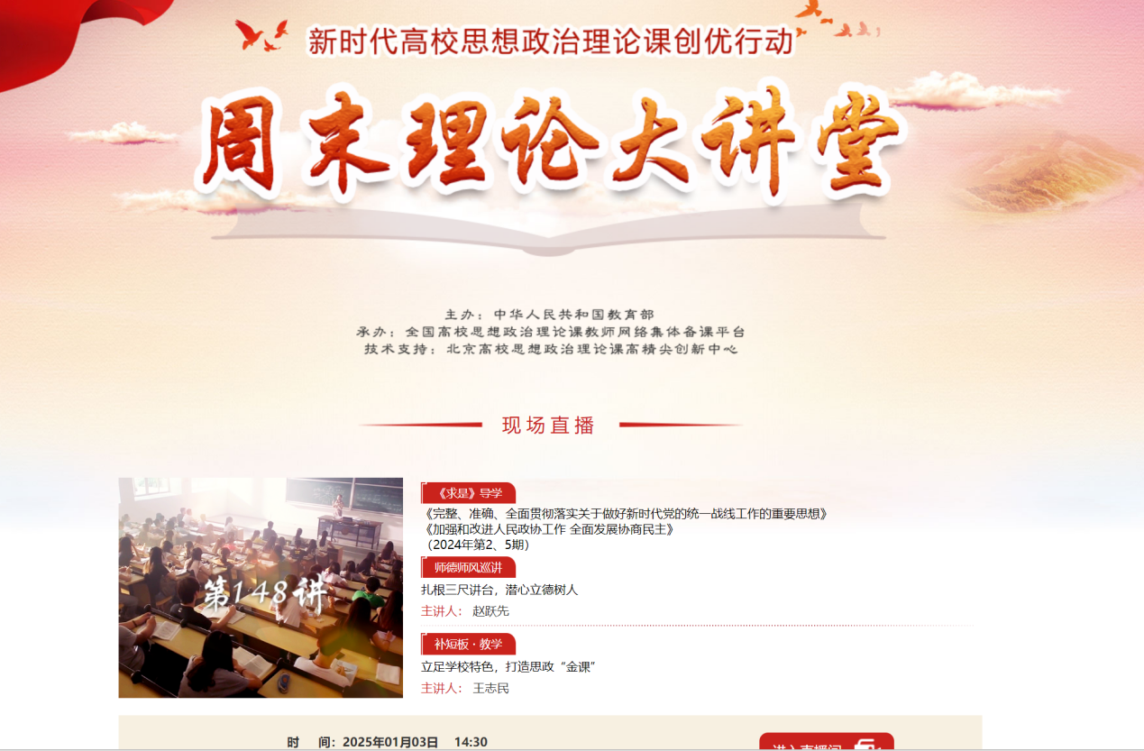 1月3日,由教育部主辦,全國高校思想政治理論課教師網(wǎng)絡(luò)集體備課平臺(tái)承辦的“周末理論大講堂”第148講開講。馬克思主義學(xué)院組織全體思政課教師觀看。