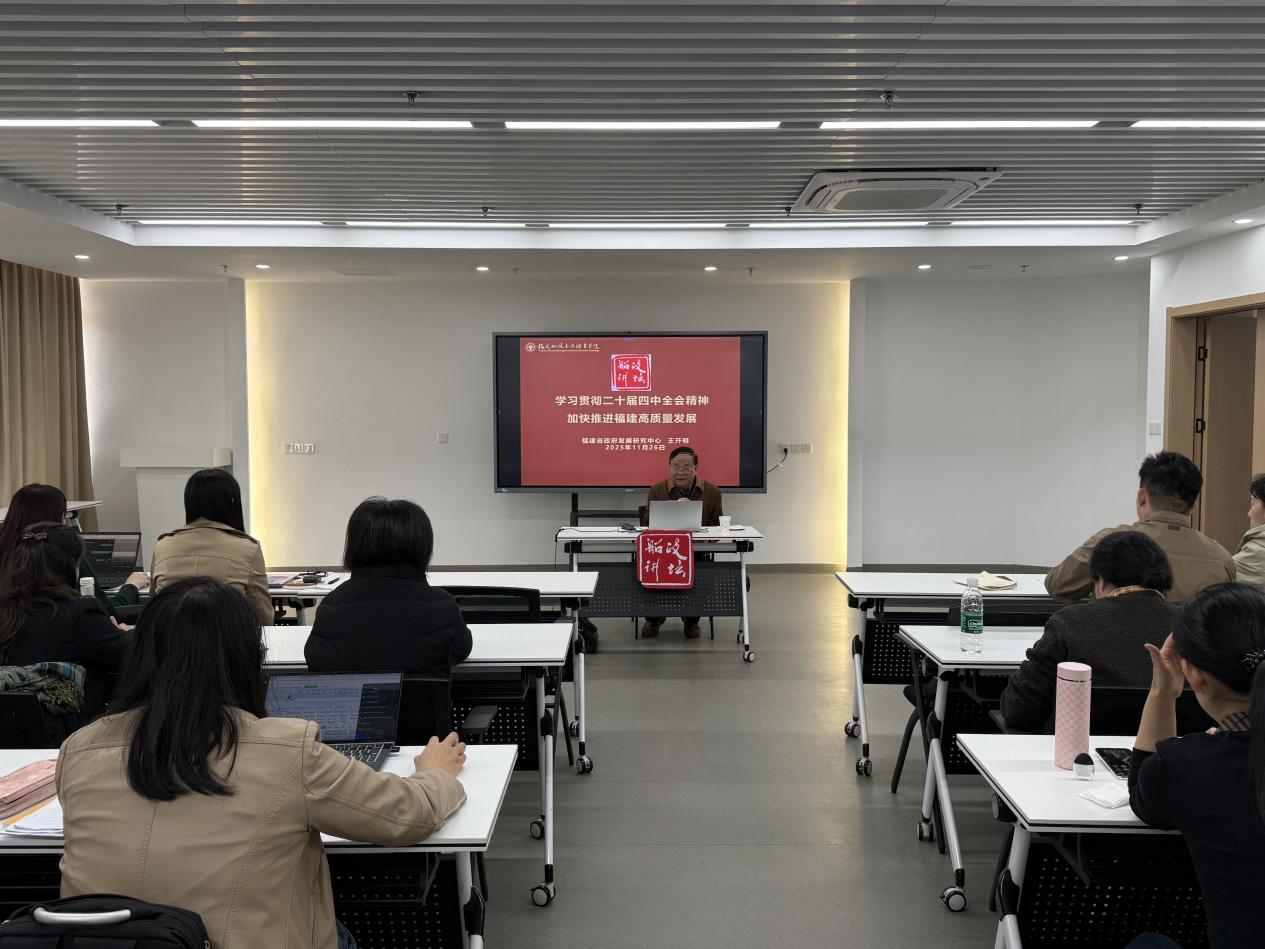11月26日,福建省人民政府發(fā)展研究中心原副主任王開明研究員受邀蒞臨學(xué)院,作題為《學(xué)習(xí)貫徹黨的二十屆四中全會精神,加快推進(jìn)福建高質(zhì)量發(fā)展》專題報(bào)告。全體馬克思主義學(xué)院黨員教師參加,共同學(xué)習(xí)領(lǐng)會全會精神與福建發(fā)展實(shí)踐的深度融合之道。