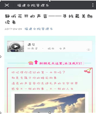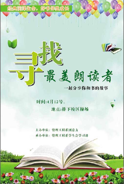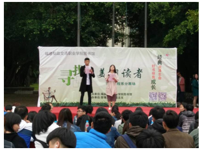 為了大力響應(yīng)國(guó)家關(guān)于全民閱讀的號(hào)召,傳播社會(huì)主義先進(jìn)文化,提高廣大船政學(xué)子的文化素質(zhì),濃厚校園學(xué)習(xí)氛圍,形成我院學(xué)生良好的學(xué)習(xí)風(fēng)氣,展現(xiàn)船政學(xué)子的風(fēng)采,樹立良好的社會(huì)形象,引導(dǎo)大家走進(jìn)閱讀社會(huì),共享閱讀快樂,多讀書,讀好書,與好書相伴,學(xué)院圖書館于2017年4月1日至4月20日期間,在全院范圍內(nèi)開展“福建船政交通職業(yè)學(xué)院圖書館讀書日2017世界詩(shī)歌日特別活動(dòng)”。作為活動(dòng)分會(huì)場(chǎng),管理工程系于2017年4月12日在排下校區(qū)操場(chǎng)舉辦了“尋找最美朗讀者”活動(dòng)。
