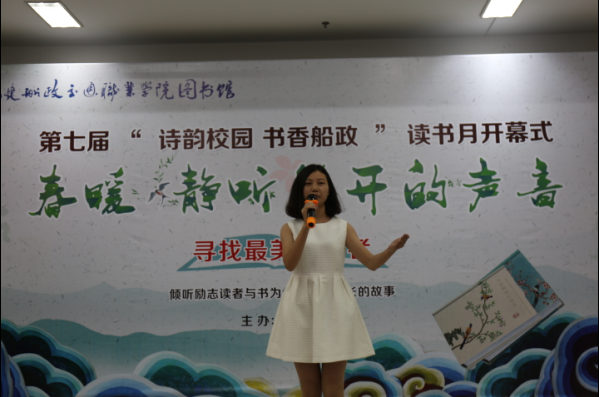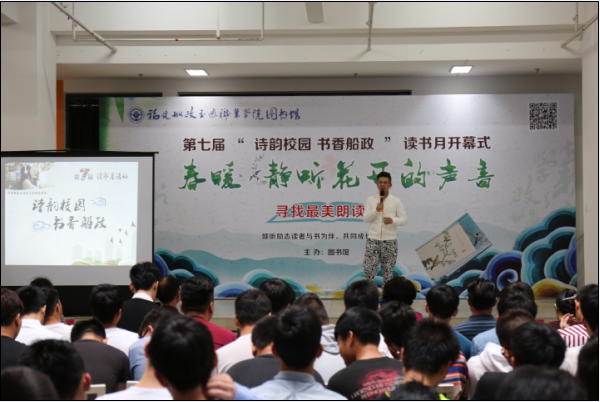 4月26日下午,我院隆重舉行“尋找最美朗讀者”活動(dòng)決賽暨“詩(shī)韻校園 書(shū)香船政”圖書(shū)館第七屆讀書(shū)月系列活動(dòng)開(kāi)幕式。學(xué)院陳艷紅副院長(zhǎng)、相關(guān)職能部門負(fù)責(zé)人、各系部黨總支書(shū)記及優(yōu)秀校友福建電視臺(tái)著名主持人陳朱海應(yīng)邀參加了開(kāi)幕活動(dòng)。