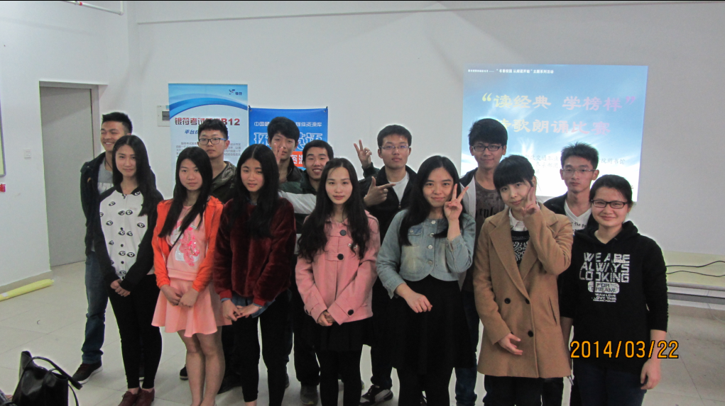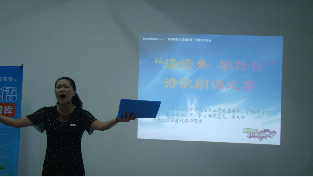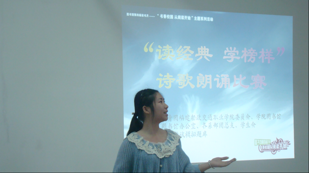 3月22日,圖書館“書香校園從閱讀開始”第四屆讀書月系列活動(dòng)“讀經(jīng)典學(xué)榜樣”詩歌朗誦比賽在圖書館9樓活動(dòng)室舉行。全院近30名選手報(bào)名參加了比賽。