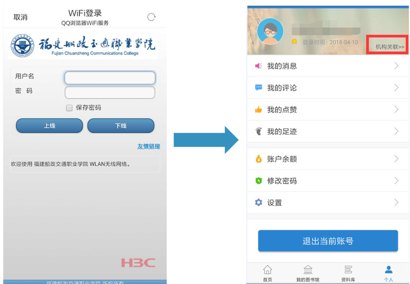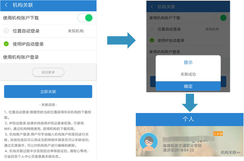 用戶登錄→首頁(yè)→個(gè)人→機(jī)構(gòu)關(guān)聯(lián),在連接校園網(wǎng)的前提下,選擇使用IP自動(dòng)登錄,點(diǎn)擊立即關(guān)聯(lián)。關(guān)聯(lián)成功后15日內(nèi)皆可漫游在校外使用。過期重新關(guān)聯(lián)即可。
