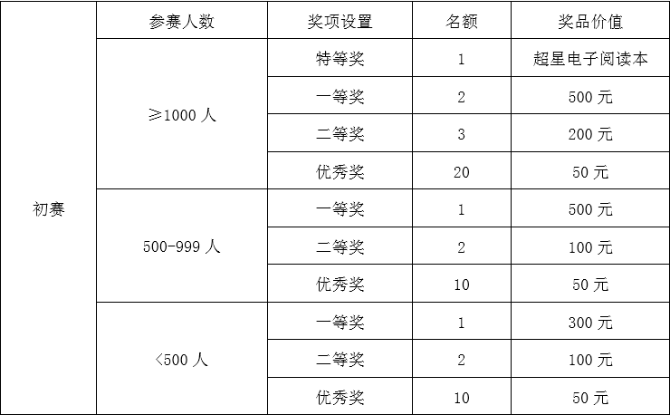 注:特等獎 超星電子閱讀本(內置五萬本暢銷圖書) 限10臺,參賽人數(shù)優(yōu)先滿足條件的學校優(yōu)先取得。