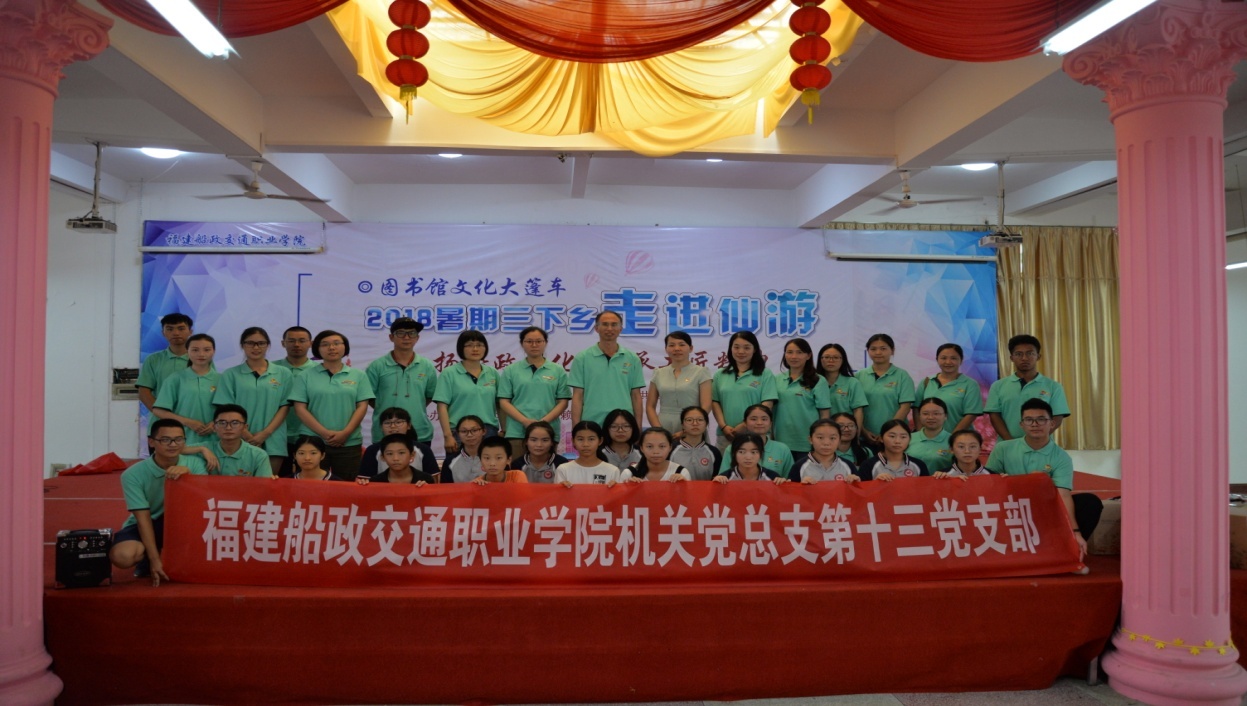 為深入學(xué)習(xí)宣傳貫徹習(xí)近平新時(shí)代中國特色社會主義思想和黨的十九大精神,圍繞助力鄉(xiāng)村振興戰(zhàn)略和精準(zhǔn)脫貧,引導(dǎo)我院青年學(xué)生貢獻(xiàn)青春智慧和力量,積極投身社會實(shí)踐。2018年暑期,機(jī)關(guān)黨總支第十三黨支部帶領(lǐng)圖書館思源志愿服務(wù)隊(duì)共計(jì)25名師生依托 “文化大篷車”項(xiàng)目,組成了圖書館暑期三下鄉(xiāng)“教育關(guān)愛服務(wù)隊(duì)”,帶著我院師生的愛心,通過以“弘揚(yáng)船政文化 傳承工匠精神”為主旨的一系列服務(wù)活動,在仙游開展了為期一周的暑期社會實(shí)踐活動,將滿滿的愛意傳遞到仙游縣市民的心中。