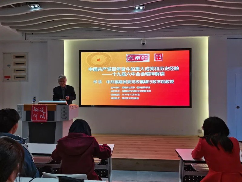 12月29日下午,由福建省社科聯(lián)和福建省圖書館主辦的東南周末講壇走進(jìn)福建船政交通職業(yè)學(xué)院圖書館,攜手船政講壇開展《中國共產(chǎn)黨百年奮斗的重大成就和歷史經(jīng)驗(yàn)——十九屆六中全會(huì)精神解讀》專題講座。福建船政交通職業(yè)學(xué)院圖書館全體館員及圖學(xué)聯(lián)團(tuán)隊(duì)學(xué)生110人到場參加。