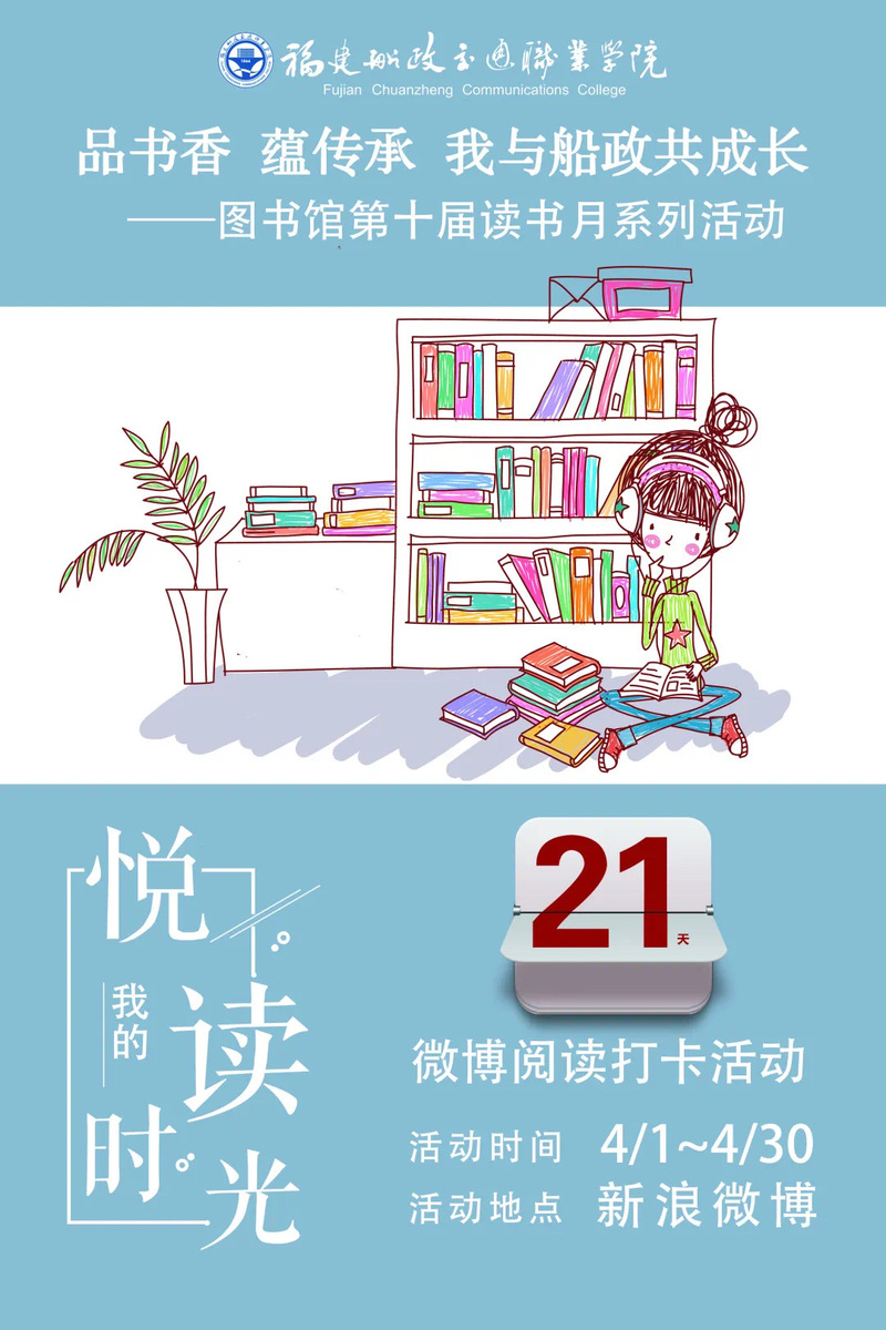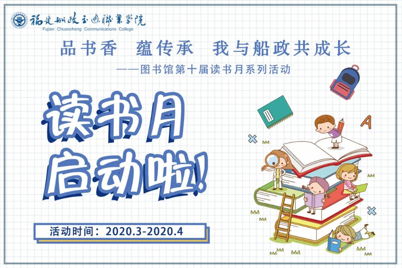 為了引導廣大師生養(yǎng)成多讀書、讀好書、好讀書的習慣,在第25個“世界讀書日”來臨之際,我院圖書館于2020年3月—4月開展“品書香,蘊船政,我與船政共成長”圖書館第十屆讀書月系列活動,活動包含豐富多彩、形式多樣的線上閱讀活動,同時我們也為大家準備了各種精美的禮品。希望廣大師生及時關(guān)注我館的微博、微信公眾號,歡迎大家的參與!