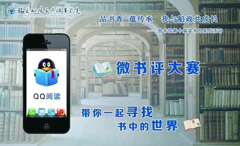 “品書香,蘊(yùn)傳承,我與船政共成長(zhǎng)”圖書館第十屆讀書月系列活動(dòng)火熱進(jìn)行中,本次“微書評(píng)”大賽與QQ閱讀聯(lián)合推出。