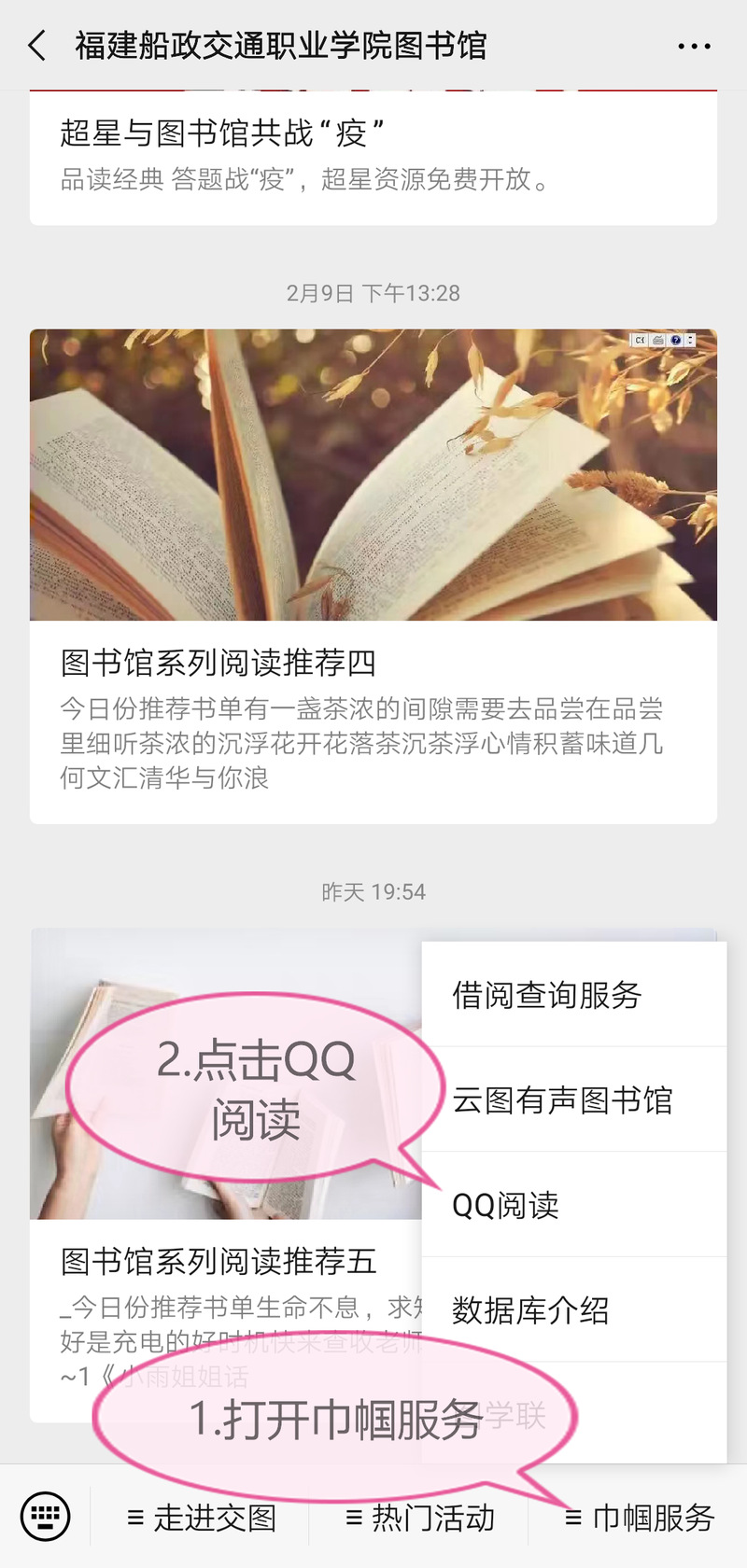 活動(dòng)規(guī)則:推薦(《追風(fēng)箏的人》、《活著》、《霍亂時(shí)期的愛(ài)情》、《明朝那些事兒》、《我們仨》、《浮生六記》、《挪威的森林》、《看見(jiàn)》)8本精選主題書籍,師生進(jìn)入福建船政交通職業(yè)學(xué)院圖書館微信公眾號(hào),選擇此次活動(dòng),在活動(dòng)通知內(nèi)選擇一本圖書作為參賽圖書,然后掃碼閱讀,在文末對(duì)所選圖書撰寫微書評(píng),參加人氣評(píng)選。也可進(jìn)入圖書館微信公眾號(hào),選擇菜單欄“巾幗服務(wù)”,點(diǎn)擊“QQ閱讀”,自行搜索閱讀,更有10多萬(wàn)冊(cè)熱門電子書等你來(lái)讀。