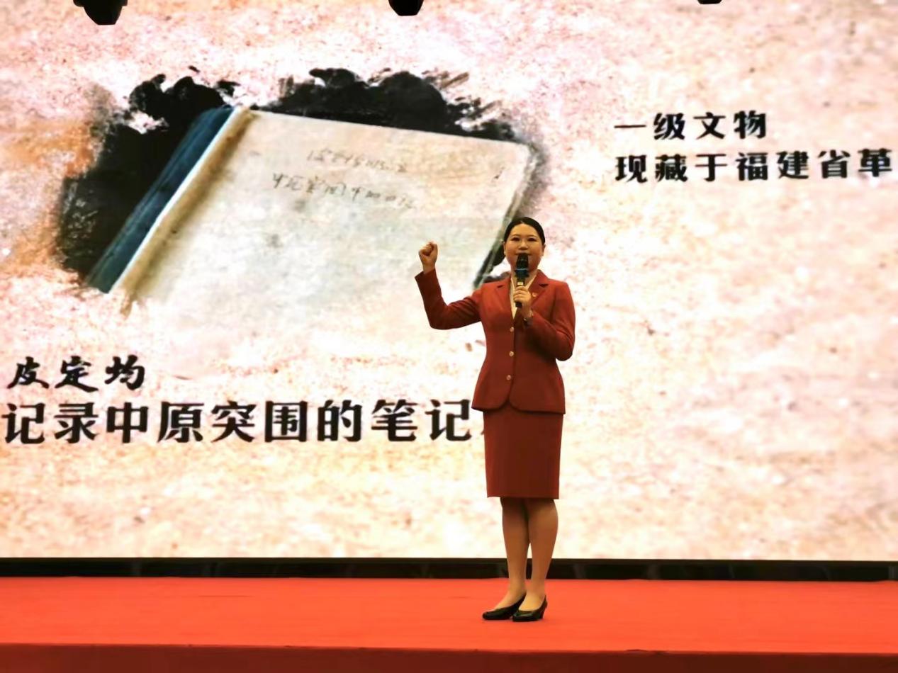 宣講會(huì)上,來自福建省革命紀(jì)念館的“福建紅”宣講團(tuán)的宣講員館長楊衛(wèi)東為大家宣講了《一顆埋藏在身體里66年的子彈頭》,林碩靖、丁叮盯、林綺璐為大家分別講述了《一支書寫忠誠與擔(dān)當(dāng)?shù)墓P》、《跨越大洋彼岸的生死之交》、《福建紅,紅在風(fēng)展紅旗如花、紅在閩山閩水物華新》的故事。