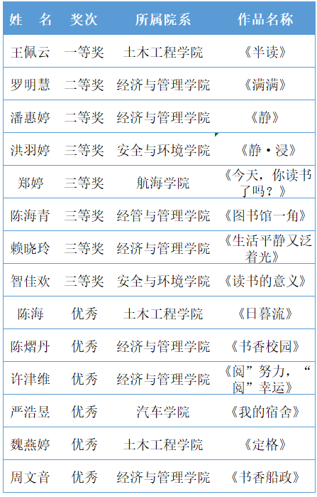 經過一個多月的作品征集及評選,我館共收到來自九個學院幾百篇優(yōu)秀的攝影作品,經過評比有14名同學進入終評,最終評選出一等獎1名,二等獎2名,三等獎5名,優(yōu)秀獎6名。讓我們一起來看看,是哪些獲獎者吧~