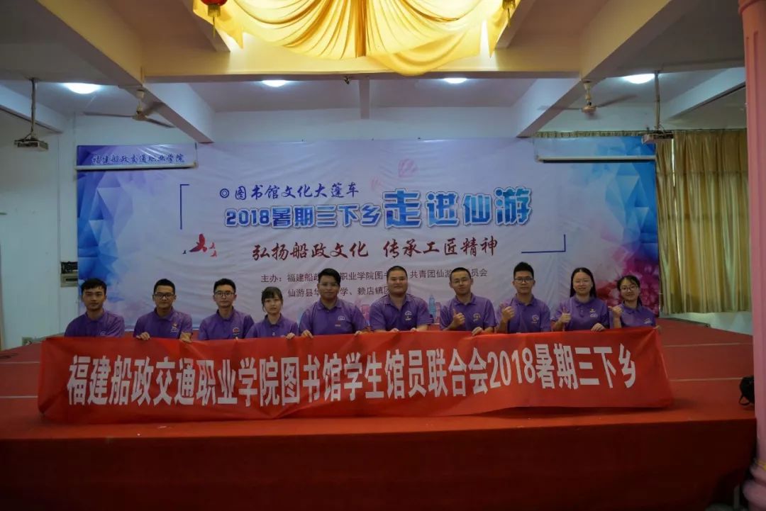 2018年我館依托圖書館“文化大篷車”項(xiàng)目,組成教育關(guān)愛(ài)服務(wù)團(tuán)“三下鄉(xiāng)”服務(wù)隊(duì),開(kāi)展“弘揚(yáng)船政文化,傳承工匠精神”----圖書館文化大篷車2018暑期三下鄉(xiāng)走進(jìn)仙游活動(dòng),開(kāi)展豐富多彩的活動(dòng),取得喜人的成績(jī),獲得了共青團(tuán)福建省委授予的福建省大中專學(xué)生暑期“三下鄉(xiāng)”社會(huì)實(shí)踐活動(dòng)“先進(jìn)集體”的榮譽(yù)稱號(hào)。