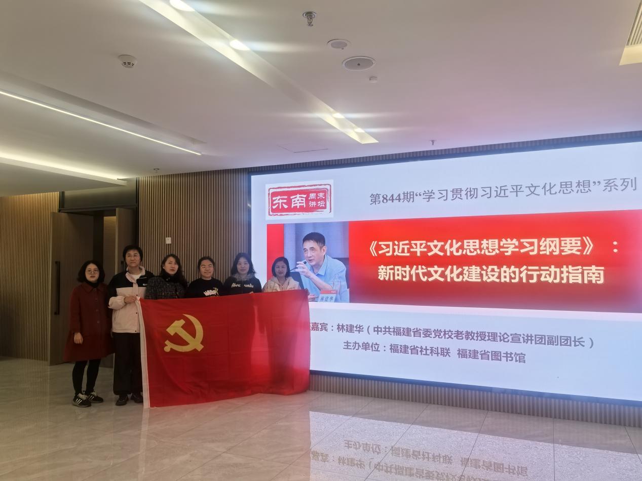 為深入學(xué)習(xí)貫徹習(xí)近平文化思想,深化新時(shí)代文化建設(shè)理念,2025年3月29日上午,圖書(shū)館黨支部全體黨員及十余名學(xué)生志愿者赴福建省圖書(shū)館,為讀者開(kāi)展志愿服務(wù)及主題黨日活動(dòng)。參與福建省圖書(shū)館《閩圖大學(xué)堂》“學(xué)習(xí)貫徹習(xí)近平文化思想”系列講座。