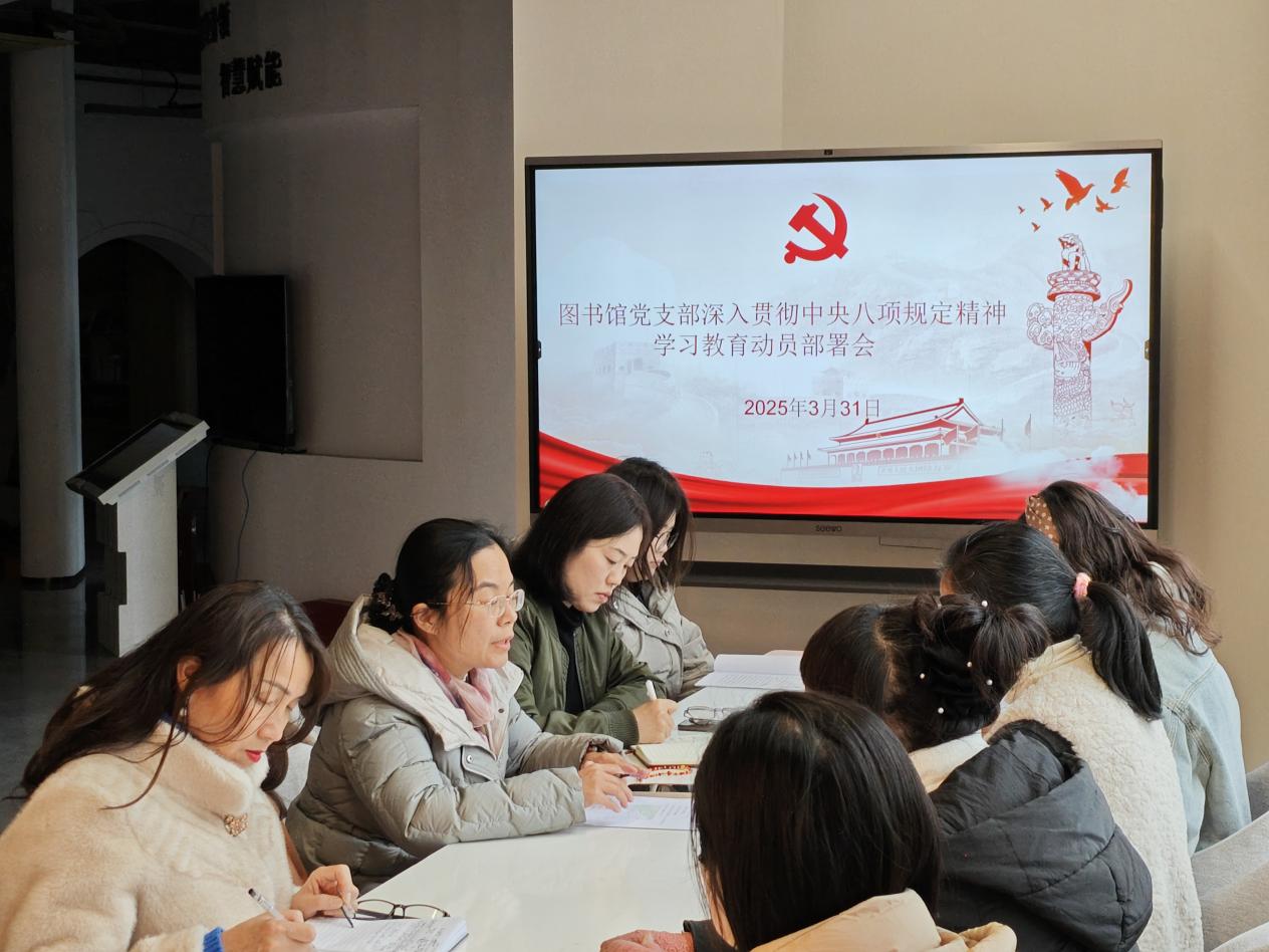 2025年3月31日,圖書館黨支部召開專題會議,會議傳達了學院關于深入貫徹中央八項規(guī)定精神學習教育動員會議的工作部署要求,全面動員和部署支部學習教育工作。會議由黨支部陳林書記主持,全體黨員參加。陳林書記指出,開展此次習教育是落實習近平總書記重要指示精神、鞏固深化主題教育成果、推進全面從嚴治黨向基層延伸的重要舉措。支部全體黨員干部要提高政治站位,深刻認識作風建設對學院高質(zhì)量發(fā)展、師德師風建設及服務師生的重要意義,切實將思想和行動統(tǒng)一到黨中央決策部署上來。會議強調(diào),要結(jié)合圖書館工作實際,學深悟透,通過集中學習、個人自學等形式,深入領會中央八項規(guī)定精神的核心要義,將作風建設貫穿文獻資源服務、讀者服務、內(nèi)部管理全過程;查改結(jié)合,對照黨章黨規(guī)和崗位職責,全面查擺服務意識、工作效能、紀律執(zhí)行等方面存在的問題,建立整改臺賬并限期落實;長效常治,將學習教育與巡視整改相結(jié)合,完善制度規(guī)范,推動作風建設常態(tài)化、制度化。