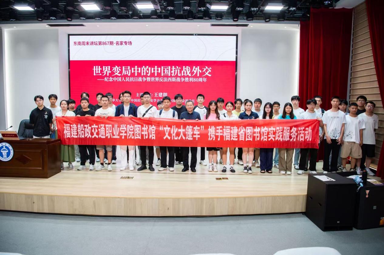 為深入學(xué)習(xí)貫徹黨的二十大精神,紀(jì)念中國(guó)人民抗日戰(zhàn)爭(zhēng)暨世界反法西斯戰(zhàn)爭(zhēng)勝利80周年,引導(dǎo)船政學(xué)子銘記歷史、緬懷先烈、珍愛和平,我校圖書館“文化大篷車”攜手省圖書館開展紀(jì)念中國(guó)人民抗日戰(zhàn)爭(zhēng)暨世界反法西斯戰(zhàn)爭(zhēng)勝利80周年社會(huì)實(shí)踐活動(dòng),激勵(lì)船政師生傳承紅色基因,勇?lián)鷷r(shí)代使命。