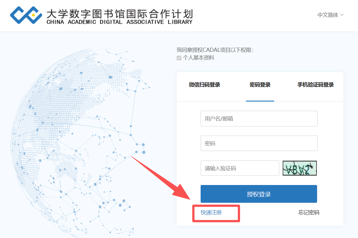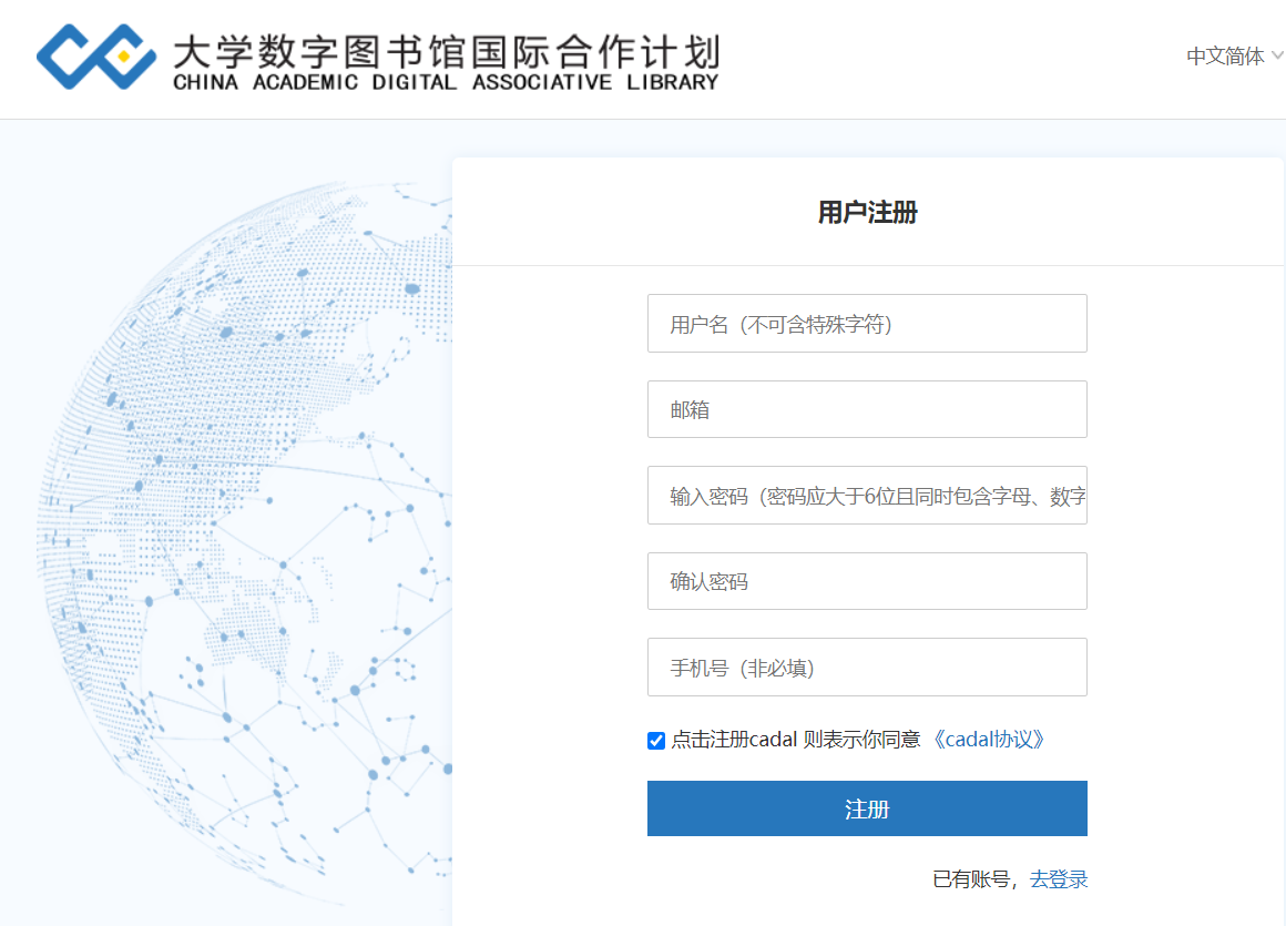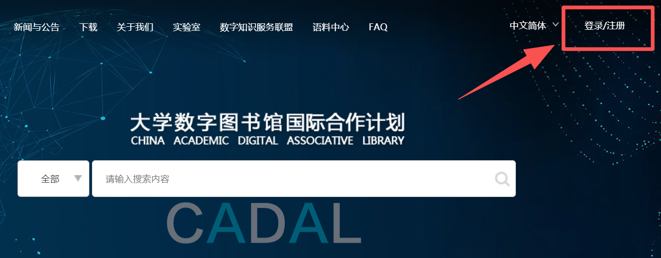 訪問(wèn)CADAL官網(wǎng)(搜索:大學(xué)數(shù)字圖書(shū)館國(guó)際合作計(jì)劃),點(diǎn)擊右上角“登錄/注冊(cè)”即可打開(kāi)登錄頁(yè)面。