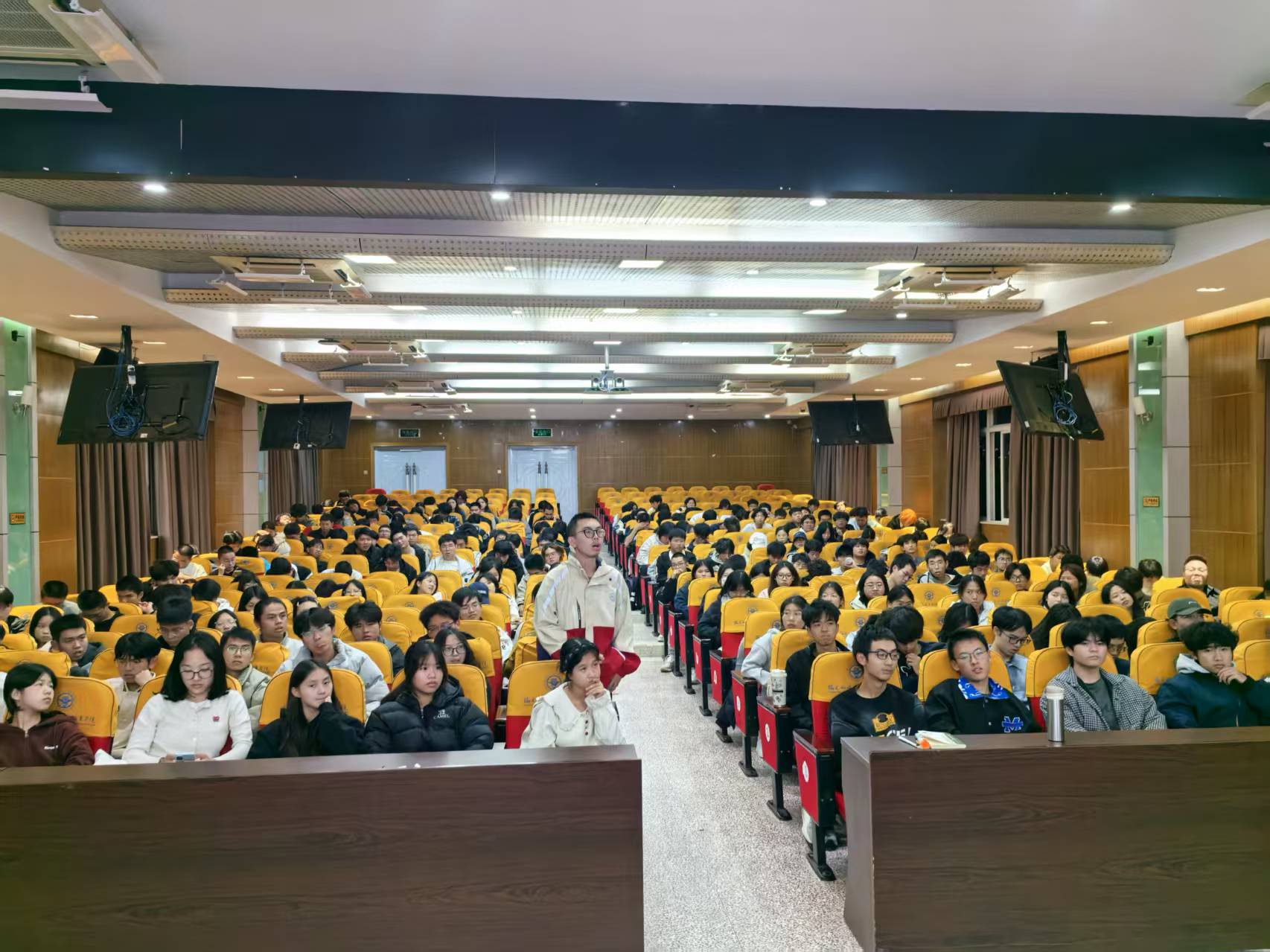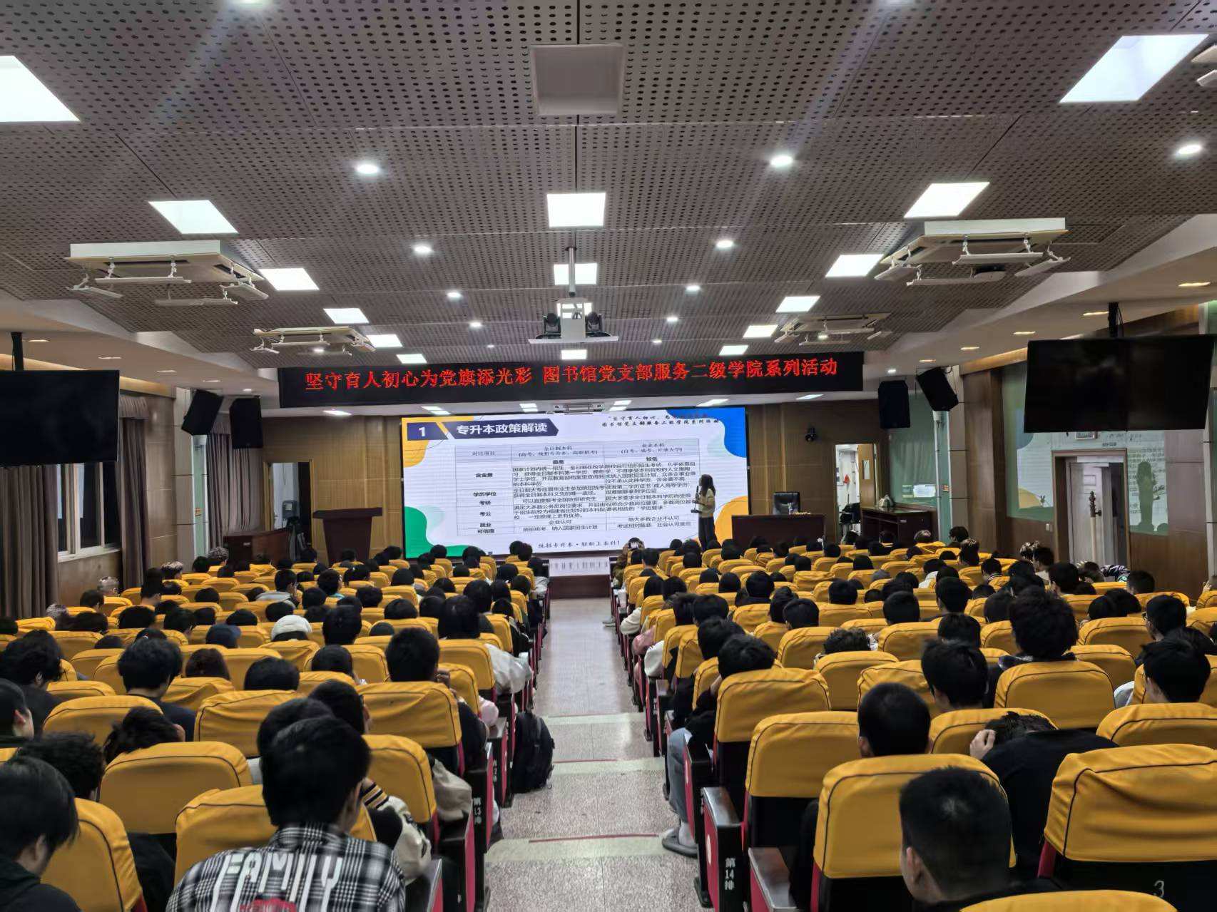 為幫助2025級(jí)新生精準(zhǔn)把握專(zhuān)升本政策導(dǎo)向,科學(xué)規(guī)劃學(xué)業(yè)生涯,2025年11月19日晚7時(shí)在福道園行政樓6樓學(xué)術(shù)廳,圖書(shū)館黨支部開(kāi)展服務(wù)二級(jí)學(xué)院系列活動(dòng)——舉辦“專(zhuān)升本學(xué)習(xí)規(guī)劃”專(zhuān)題講座。邀請(qǐng)專(zhuān)升本政策規(guī)劃師曾巧霞老師為同學(xué)們作專(zhuān)升本政策解讀與報(bào)考指導(dǎo),2025級(jí)近300名同學(xué)聆聽(tīng)了講座。