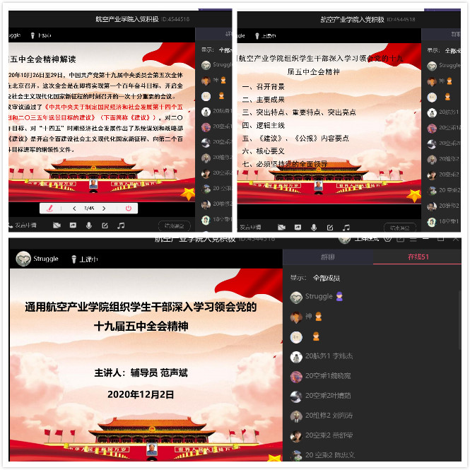為深入學(xué)習(xí)貫徹黨的十九屆五中全會精神,切實將思想與行動統(tǒng)一到十九屆五中全會精神上來,以實際行動迎接建黨100周年。12月2日,通用航空產(chǎn)業(yè)學(xué)院輔導(dǎo)員范聲斌,依托QQ平臺線上+線下模式為全院學(xué)生干部、入黨積極分子解讀十九屆五中全會精神。