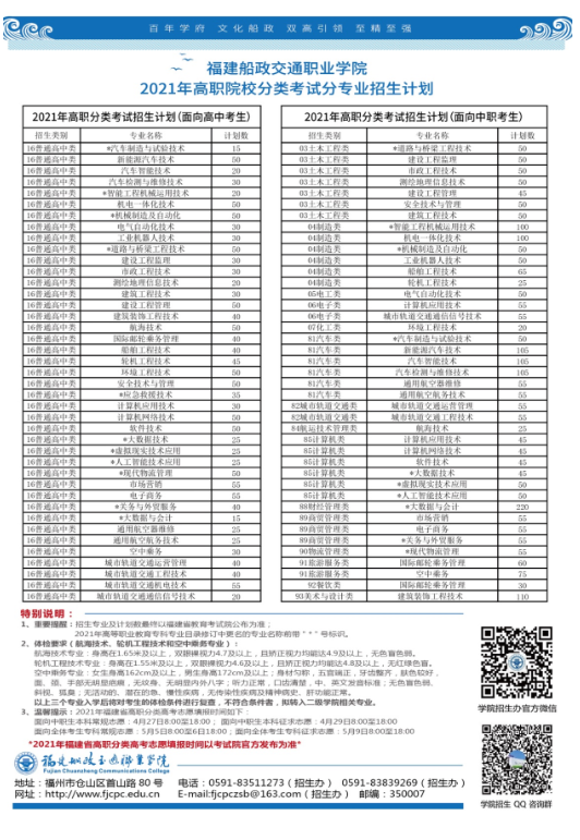 福建船政交通職業(yè)學(xué)院2021年高職院校分類考試分專業(yè)招生計劃