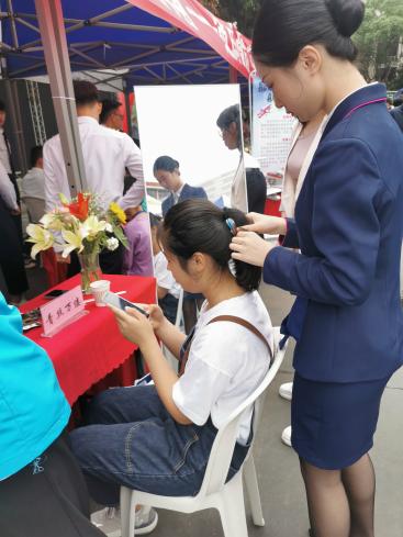 在現(xiàn)場,空乘專業(yè)的師生們搭建了化妝工位、發(fā)型塑造工位、絲巾工位、領(lǐng)帶工位,通過絲絲入扣教現(xiàn)場的來賓絲帶的配搭技巧,紳士酒窩來教授如何正確的進(jìn)行系領(lǐng)帶,青絲萬縷幫來賓們盤發(fā),告訴來賓如何更好的打理自己的發(fā)型,展示自己,濃妝淡抹是當(dāng)天最受歡迎的展臺,絡(luò)繹不絕的來賓到這里學(xué)習(xí)在職場在生活中,如何得體的化妝,展示更好的自己。