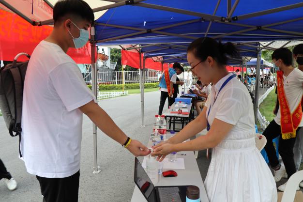 船政南區(qū)校門,同學們佩戴口罩,進行測量體溫,同時對隨身物品進行消毒后方可進入前往報到處。