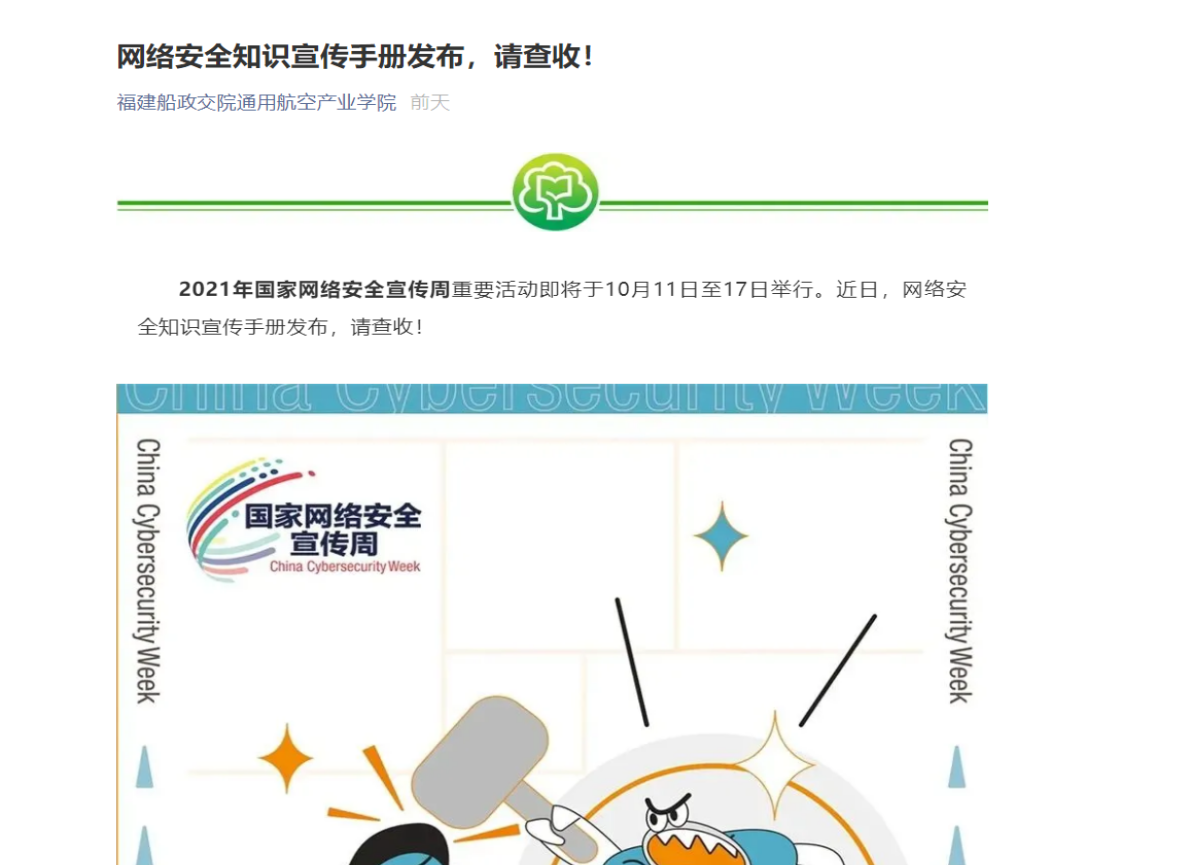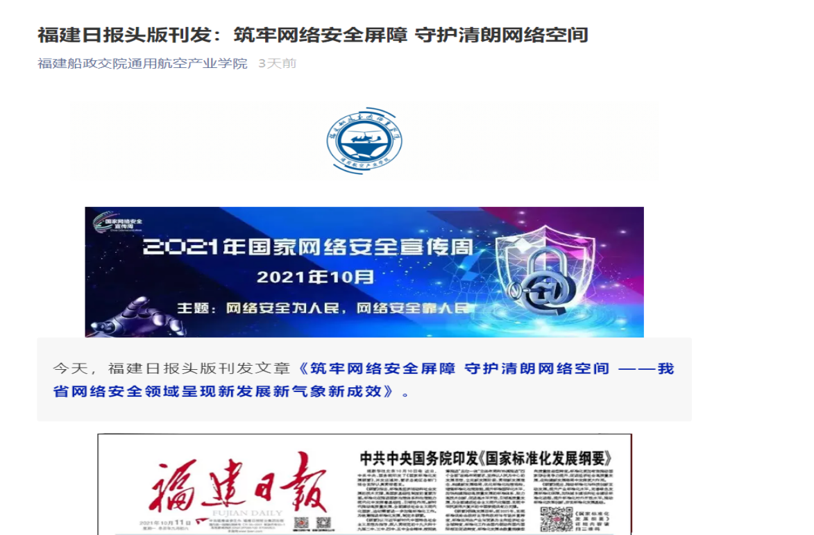 在2021年國家網(wǎng)絡(luò)安全宣傳周期間,通航空產(chǎn)業(yè)學(xué)院開展了一系列線上線下活動,引導(dǎo)師生養(yǎng)成依法上網(wǎng)、文明上網(wǎng)、安全上網(wǎng)的良好習(xí)慣。二是轉(zhuǎn)載官方網(wǎng)站宣傳網(wǎng)絡(luò)安全小視頻,提醒師生保護個人信息,謹(jǐn)防被騙;三是全方位動員師生自覺成為維護國家網(wǎng)絡(luò)安全的重要力量,爭做網(wǎng)絡(luò)安全的踐行者、參與者、推動者、宣傳者,為共享共建清朗、便捷的網(wǎng)絡(luò)空間,共同維護國家網(wǎng)絡(luò)安全營造良好的氛圍。