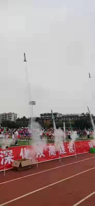 十枚易拉罐制作的模型火箭與一枚長(zhǎng)征二號(hào)仿真火箭騰空而起