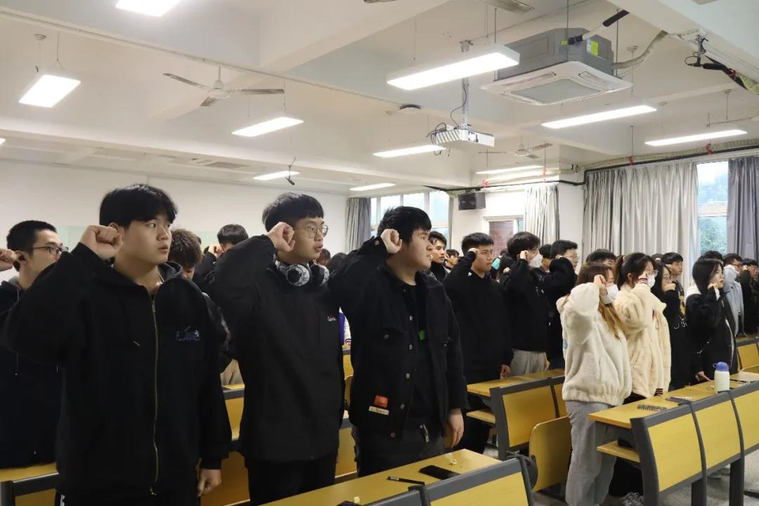 隨后,全體同學(xué)起立,舉起右拳,宣讀誠信考試宣誓詞。同學(xué)們鏗鏘有力的聲音回蕩在教室上方,相信同學(xué)們心中已經(jīng)明確了誠信應(yīng)考的重要性。