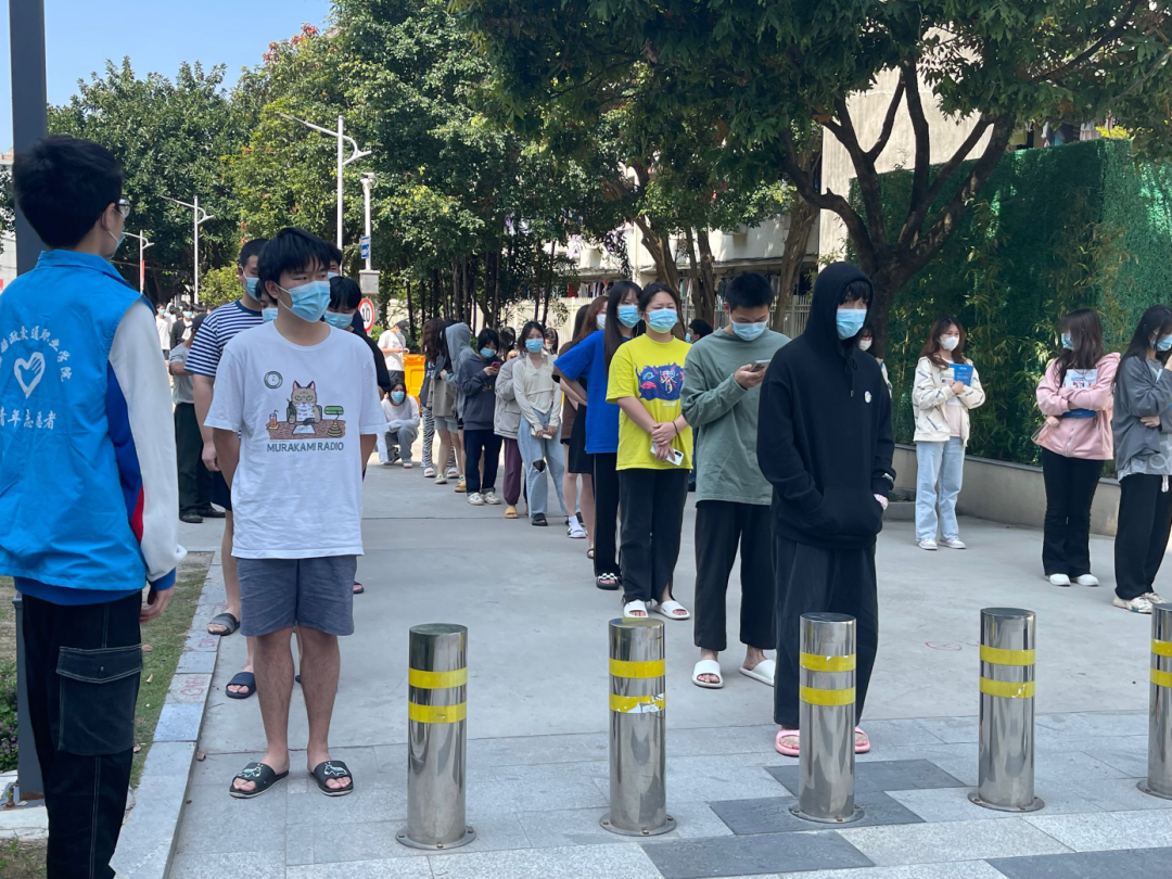 活動開展過程中,同學們在志愿者的組織下,井然有序地排好隊,都保持著一米間隔等待核酸檢測。