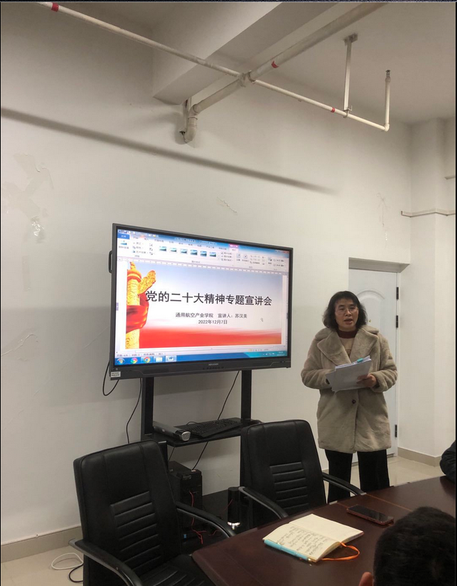 學校黨的二十大精神宣講團成員、通用航空產(chǎn)業(yè)學院黨總副支書記蘇漢美以《深入學習貫徹黨的二十大精神,努力推動職業(yè)教育高質(zhì)量發(fā)展》為主題,從黨的二十大的主題及主要成果、過去5年的工作和新時代10年的偉大變革、開辟馬克思主義中國化時代化新境界、以中國式現(xiàn)代化全面推進中華民族偉大復興、黨和國家事業(yè)的新部署新要求、堅定不移推進全面從嚴治黨的部署和要求、努力推動職業(yè)教育高質(zhì)量發(fā)展的若干思考共七個方面進行了宣講。