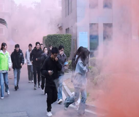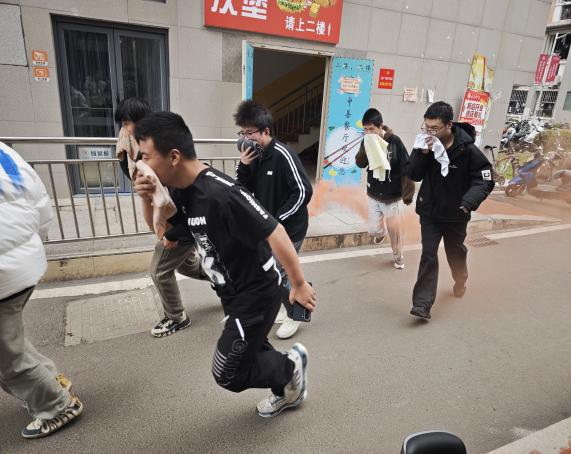 通過校園內(nèi)警報聲驟然響起,各宿舍樓的學生在老師和工作人員的引導下,迅速用濕毛巾捂住口鼻,低姿前行,沿著預定的疏散路線有序撤離。整個過程緊張有序,全體參演學生就安全疏散至學校操場的指定區(qū)域。