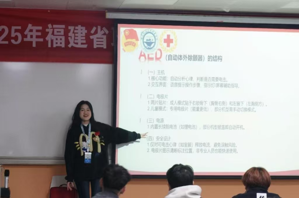 培訓(xùn)活動在福建船政交通職業(yè)學(xué)院南區(qū)舉行,活動現(xiàn)場的紅十字會志愿者在理論介紹環(huán)節(jié)從心臟驟停的危害和常見原因,到AED在急救中的關(guān)鍵作用,詳細闡述了每一個重要知識點,接下來又通過生動的案例和直觀的視頻展示,講解了體外除顫器(AED)的使用以及使用場景,讓同學(xué)們深刻認識到掌握急救技能的重要性和緊迫性。