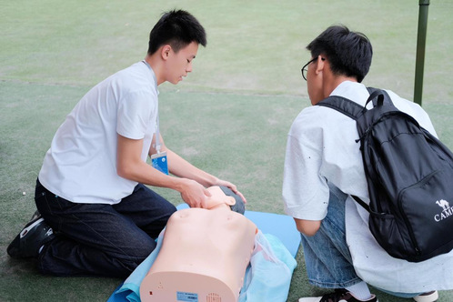 為普及急救知識與技能,使更多學(xué)生掌握心肺復(fù)蘇、止血包扎等基礎(chǔ)急救操作方法,通用航空產(chǎn)業(yè)學(xué)院于2025年10月22日在福船園操場組織開展了以“守護生命,救在身邊”為主題的線下急救知識科普活動。