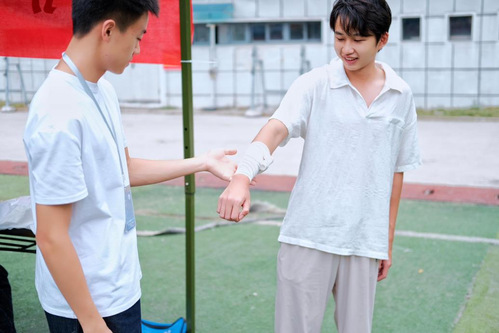 活動通過趣味問答、現(xiàn)場演示等豐富形式,吸引了大量同學(xué)參與。抽象的急救知識在互動題目中變得直觀可感,激發(fā)了大家的求知欲。隨后的實操環(huán)節(jié)中,在志愿者“手把手”的教導(dǎo)下,同學(xué)們紛紛拿起三角巾和繃帶,為同伴模擬包扎頭部與四肢,認(rèn)真練習(xí)止血與固定技巧。心肺復(fù)蘇(CPR)教學(xué)更是將氣氛推向高潮,志愿者不僅詳盡演示,更引導(dǎo)同學(xué)們逐一在模擬人上實踐,確保要領(lǐng)深入人心。整個現(xiàn)場互動頻繁,討論熱烈,洋溢著積極向上的學(xué)習(xí)熱情。