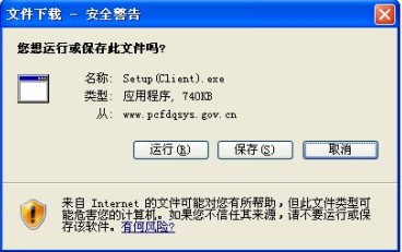 第一步:點(diǎn)擊本窗口最下端的“軟件下載”按鈕,在彈出的文件下載窗口里,選擇“運(yùn)行”進(jìn)行安裝客戶組件,或選擇“保存”進(jìn)行先下載后安裝客戶組件。(若本機(jī)裝有下載工具,則組件可由其下載,再進(jìn)行安裝。若組件被系統(tǒng)安全機(jī)制攔截,須同意后再下載安裝)。沒有下載工具的情況下如下圖所示:
