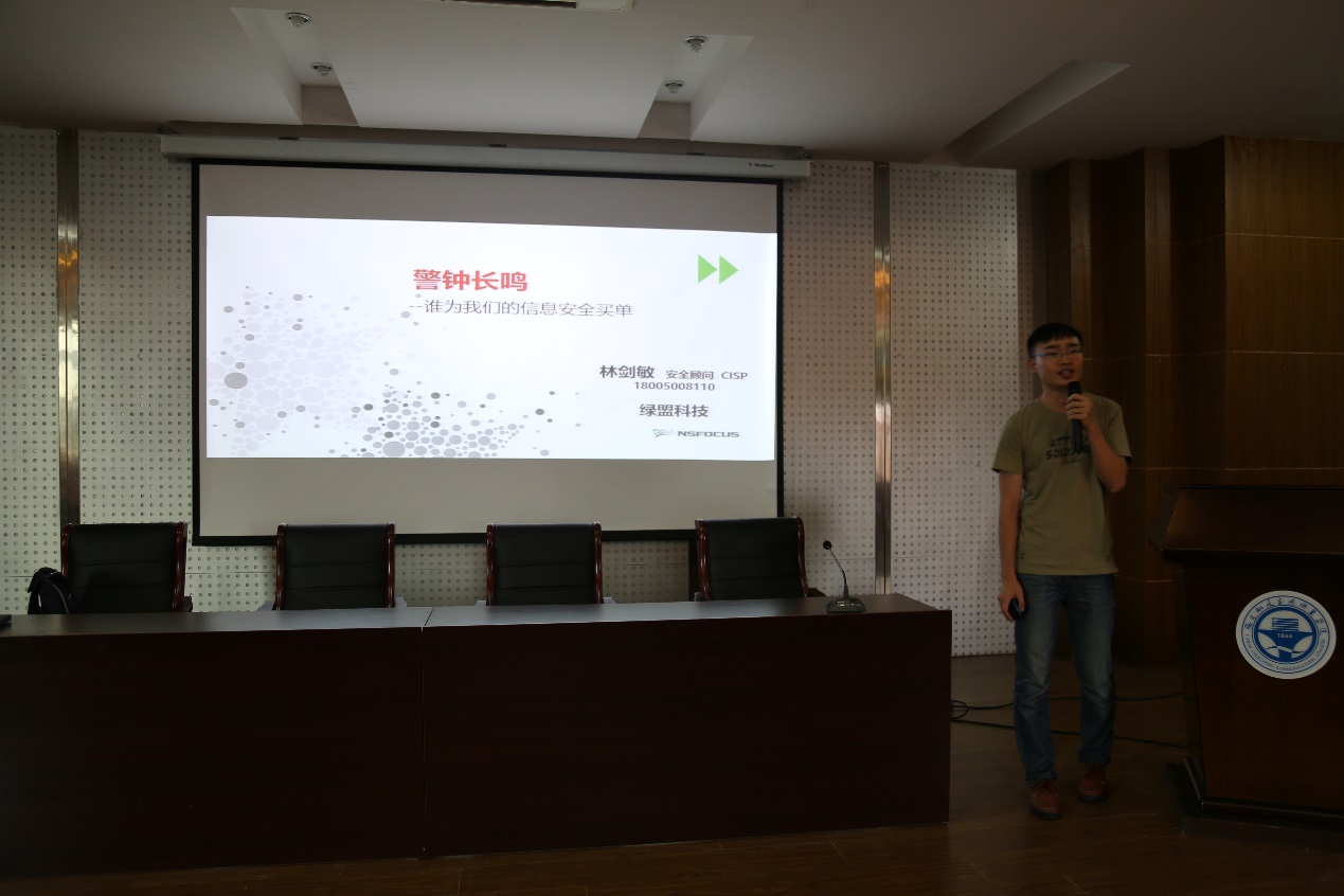 2018年6月25日下午,學(xué)院現(xiàn)代教育技術(shù)及網(wǎng)絡(luò)中心邀請北京神州綠盟科技有限公司安全顧問,中國信息安全測評中心注冊信息安全專業(yè)人員(CISP)林劍敏對我院在校生舉辦網(wǎng)絡(luò)安全知識講座,各系部總計(jì)約350名學(xué)生到場聽取講座。