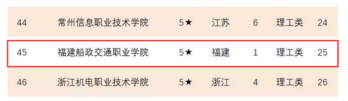 2019328日,第二屆全國高職高專院?!皟?yōu)質(zhì)校”建設(shè)與評價論壇正式發(fā)布了2019年中國高職高專院校競爭力排行榜,福建船政交通職業(yè)學(xué)院獲得5星評價,全國排名第45位,福建省第1