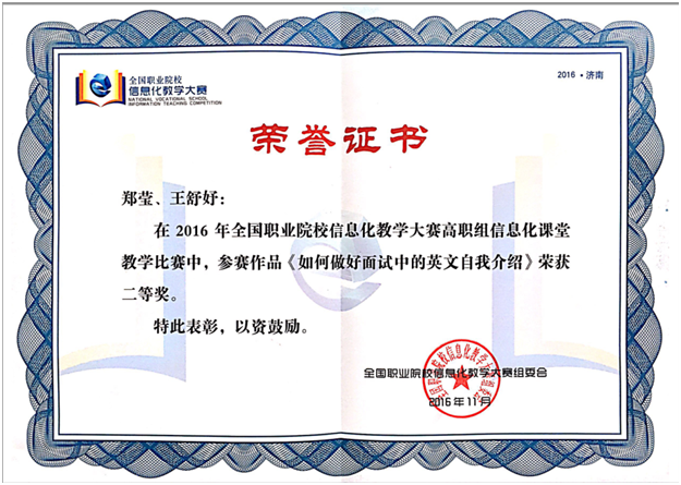 8 | 2017.01 | 2016年全國職業(yè)院校信息教學(xué)大賽 | 國家級(jí) | Unit 8 Applying for a job | 二等獎(jiǎng) | 鄭瑩、王舒妤 | ||||||||