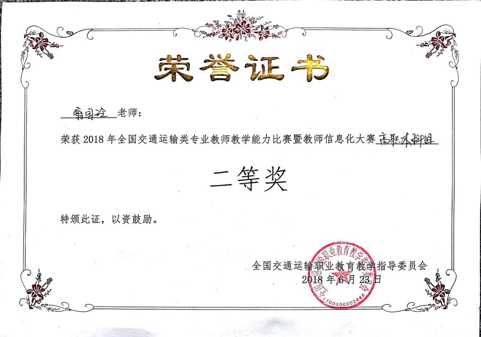 41 | 2018.06 | 2018年全國交通運(yùn)輸類專業(yè)教師信息化教學(xué)能力大賽 | 國家級(jí) | 航海氣象 | 二等獎(jiǎng) | 翁國玲 | ||||||||