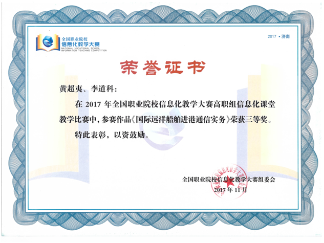 22 | 2018.01 | 2017年全國職業(yè)院校信息教學(xué)大賽 | 國家級(jí) | 國際遠(yuǎn)洋船舶進(jìn)港通信實(shí)務(wù) | 三等獎(jiǎng) | 黃超夷、李道科 | ||||||||
