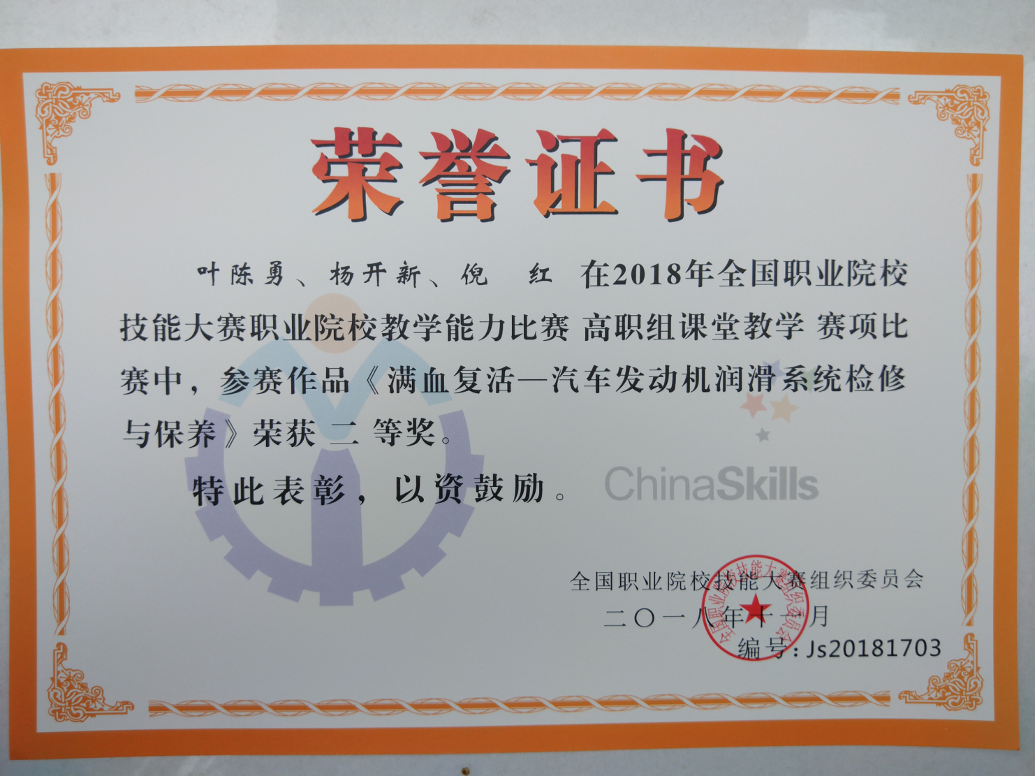 40 | 2019.01 | 2018年全國職業(yè)院校信息教學(xué)大賽 | 國家級(jí) | “滿血”復(fù)活—汽車發(fā)動(dòng)機(jī)潤滑系統(tǒng)檢修 | 二等獎(jiǎng) | 葉陳勇、楊開新、倪紅 | ||||||||