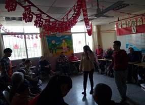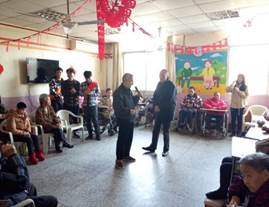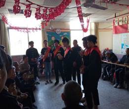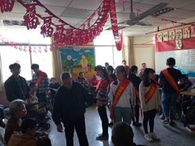 在敬老院里,志愿者們受到了敬老院領(lǐng)導(dǎo)和老人們的熱情歡迎。本次活動(dòng)大體將志愿者分為兩組,分別去一樓大廳和二樓大廳與老人們聊天解悶。志愿者們?yōu)槔先怂蜕狭宋繂?wèn)品,這一份份慰問(wèn)品蘊(yùn)涵著志愿者們對(duì)老人們的深深敬意與祝福,大家又親切地圍在老人們的身邊陪他們聊聊天,為他們捶捶背、捏捏肩,為老人們表演了一系列精心的節(jié)目。